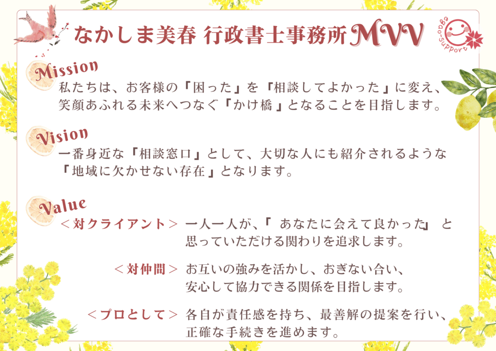 これからもこのMVVを心に、お客様に「相談してよかった」と思っていただける事務所を目指してまいります!